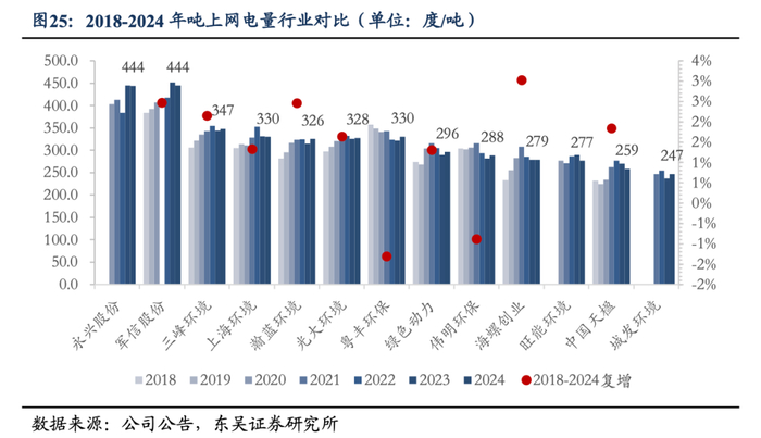 公司发电效率持续提升,2018-2024年入厂吨上网复增3%。垃圾焚烧厂吨发和吨上网电量与垃圾热值、设备技术等因素相关,在经济发达区域生活垃圾热值一般较高。横向比较,项目所在地垃圾质量的差异在很大程度上导致各企业吨发水平出现差距。纵向比较,固废板块发电效率持续提升,公司入厂平均吨上网电量从2018年的233度/吨提升至2024年的279度/吨,2018-2024年复合增速3%。