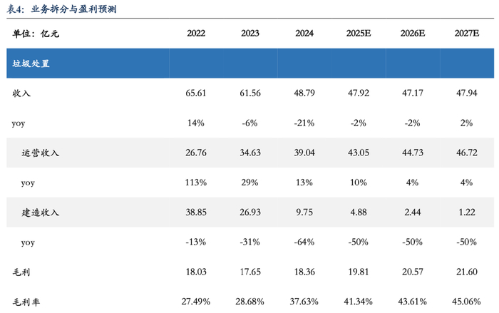 1)垃圾处置业务:运营收入随着运营规模和垃圾处置量的提升而稳步增长,依据公司在建及待开工项目情况以及供热拓展节奏,预计2025-2027年垃圾处置运营收入增速分别为10%、4%、4%;公司在手项目进入建造尾声,随着建造规模的下降,预计2025-2027年垃圾处置建造收入增速均为-50%。随着高毛利的运营收入占比提升,预计2025-2027年垃圾处置业务毛利率分别为41.34%、43.61%、45.06%。