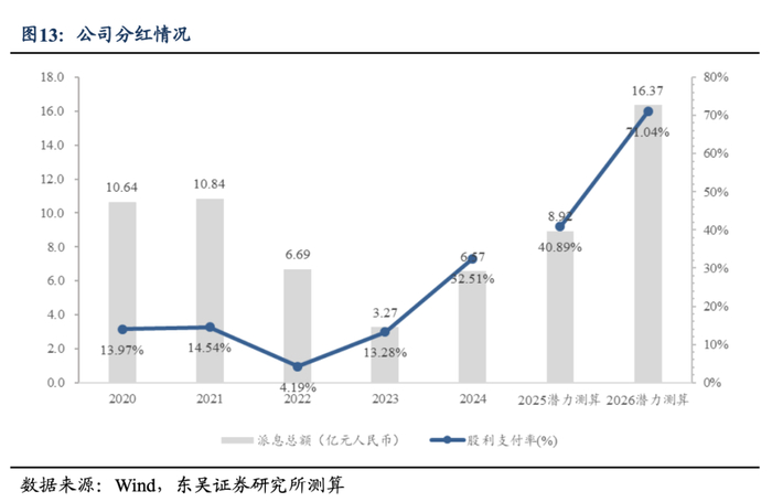 公司2024年分红比例同增19.23pct至32.51%,随着资本开支下降分红提升潜力大。2024年度派息总额为6.57亿元,同增100%,分红比例达到32.51%,同增19.23pct,对应2024年股息率4.3%。随着资本开支下降,分红提升空间大。我们根据在筹建项目情况预测2025、2026年资本开支降至10、5亿元,经营性现金流净额随着运营增长稳步提升至22、24亿元,假设来自集团股息维持24年4亿元,以“分红潜力=(简易自由现金流+来自集团股息-财务费用(参考24年))/归母净利润”测算2025和2026年分红潜力,在不依靠外部融资情况下,2025、2026年分红潜力有望达41%、71%,对应潜在股息率达5.8%、10.6%。(估值日期:2025/6/10)