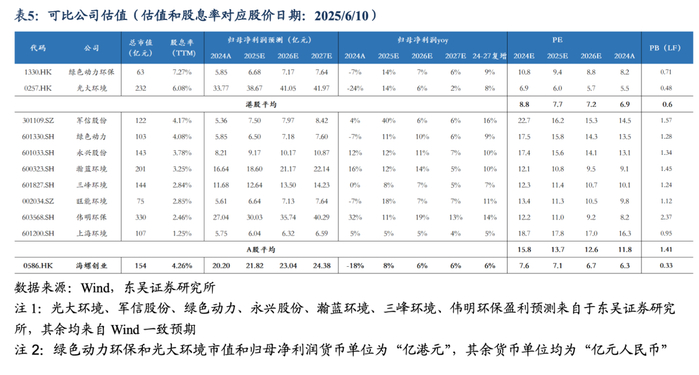 我们预计2025-2027年实现归母净利润21.82/23.04/24.38亿元,同比增长8%/6%/6%,对应PE估值为7.1/6.7/6.3倍PE。我们选取垃圾焚烧板块港股上市公司光大环境(垃圾焚烧行业龙头,全国性覆盖)、绿色动力环保(垃圾焚烧纯运营资产),及A股上市公司军信股份(长沙固废一体化龙头)、绿色动力(同“绿色动力环保”)、永兴股份(广州垃圾焚烧龙头)、瀚蓝环境(大固废整合佼佼者,水务能源协同发展)、三峰