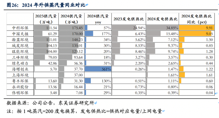 24年外供蒸汽规模大幅提高,后续挖潜空间大。2024年公司外供蒸汽量37.7万吨,较2023年(5.7万吨)增长561%,我们测算公司2024年发电供热比1.47%,同比提升1.22pct,对比行业发电供热比首位的中科环保(24年发电供热比34.85%)有较大提升空间。供热提升收益,市场化交易改善现金流。单吨垃圾产生蒸汽量介于1.6~2.5吨(因垃圾热值、燃烧效率而异),单吨蒸汽发电量200度,当蒸汽价格为150元/吨时,供热较发电单吨垃圾增收42~105元。