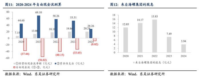 经营性现金流持续向上,资本开支快速下降,自由现金流转正在即。随着垃圾焚烧发电项目陆续投产运营,经营性现金流从2020年的7.15亿元增长到2024年20.24亿元(同比增长1.95%)并趋于稳定,展现良好的经营情况。随着在建项目的减少,资本性支出从2021年69.10亿元迅速降至2024年28.26亿元,2024年同比下降47.18%,降幅扩大。公司简易自由现金流(经营性现金流净额-资本开支)从2021年-56.02亿元增至2024年-8.02亿元。根据公司垃圾焚烧在筹建项目情况,预计自由现金流将于2025年大幅转正。除了主业创造现金流外,公司享有来自海螺集团的股息,2020-2024年分别为12.05/14.17/15.83/7.49/3.94亿元,亦可自由支配。