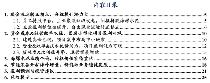 公司垃圾焚烧主业迎现金流拐点,水泥股权价值待重估。1)垃圾焚烧主业:①盈利端:资金&效率&技术助力,小型化项目盈利可观。项目建造高峰已过,建造下滑影响基本出清,未来运营提质增效将主导业绩增长,②现金流:资本开支持续下降,自由现金流将于2025年迎来转正拐点,提分红潜力大。2)权益资产:公司间接持有17.8%的海螺水泥股权,海螺水泥业绩有望企稳,权益资产价值被低估,对标海螺水泥市值重估空间大。