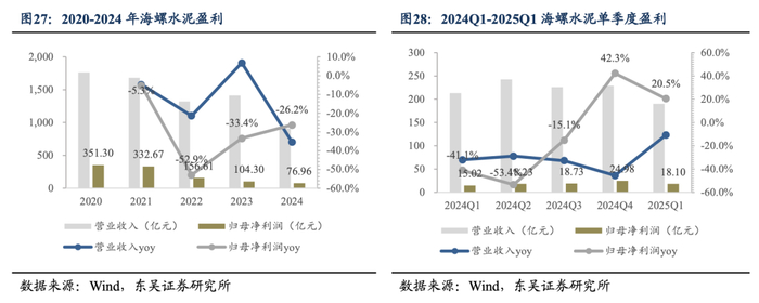 海螺水泥业绩回暖,有望延续改善趋势。近年来,受行业需求下滑、供给过剩等因素影响,海螺水泥业绩承压。海螺水泥营业收入从2020年的1762.43亿元降至2024年的910.30亿元,归母净利润从351.30亿元回落至76.96亿元。2025Q1,海螺水泥盈利呈现回暖态势,归母净利润同比增长20.5%达到18.10亿元。结合单季度业绩表现来看,2024Q4开始单季度归母净利润同比增速转正,2025Q1单季度业绩保持同比正增长,经营拐点初步确立。随着稳增长政策推动,叠加行业供需格局优化,海螺水泥盈利有望企稳。