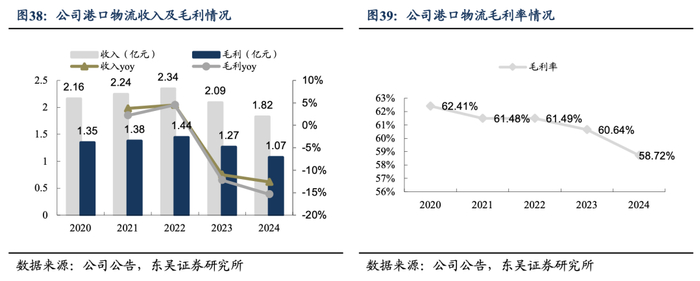 港口物流:长江流域最大的专业煤炭码头之一,作业高效,货运稳定。公司于2006年10月30日成立扬州海昌港务实业有限责任公司,2009年9月完成码头项目的全部报批工作。公司为一家专业煤炭中转码头,共建设3个7万吨级深水泊位和4个5千吨内港池泊位,拥有深水岸线1200m,后方陆域建设34平方米堆场,堆存能力达100万吨。目前主流船型5万吨海轮24小时内可卸完离港,港口装船作业能力达10万吨/天。2024年港口物流实现吞吐量约3026万吨,收入1.82亿元,同比降低13%,毛利1.07亿元,同比降低15%,毛利率58.72%,同比降低3%。收入及毛利率下降主要系市场竞争加剧,导致量价下跌所致。整体来看,港口物流业务每年贡献1亿左右毛利,经营较为稳定。