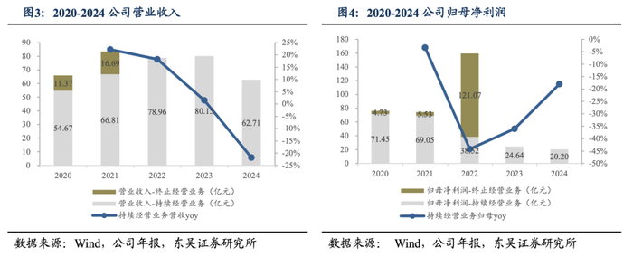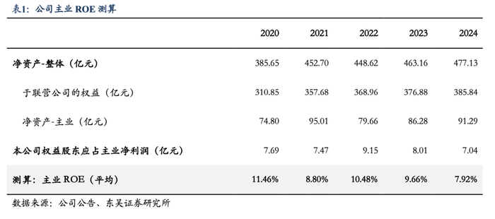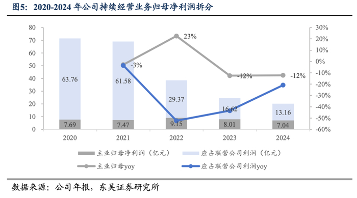 2020-2024年归母净利润下滑,主要系海螺水泥经营承压导致应占联营公司利润下降。2020-2023年公司持续经营业务收入保持增长,2024年,公司持续经营业务收入62.71亿元,同比下降21.76%,主要系垃圾处置在建项目及节能装备订单减少影响。2024年税前利润为22.50亿元,同比下降21.67%,主要原因为主业利润及应占联营公司海螺集团利润减少综合影响。2022年公司归母净利润大幅增长至159.60亿元,主要源于当年以实物分派方式将水泥窑协同处置危废业务分拆至海螺环保上市所产生的非经常性收益。2021-2024年,海螺水泥数量和价格的受大环境影响都有所下滑,导致应占联营公司利润持续萎缩。2024年公司权益股东应占净利润为20.20亿元,同比下降18.03%,1)主业:权益股东应占主业净利润为7.04亿元,同比下降12.20%,主要系垃圾处置建造收益下降,以及节能装备、新型建材、港口物流业务承压。2)权益投资收益:应占联营公司利润为13.16%,同比下降20.84%。