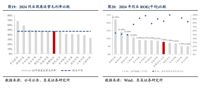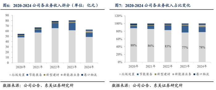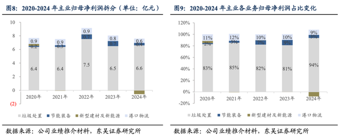 垃圾处置运营收入稳健增长,盈利结构优化,业绩稳健性增强。垃圾处置业务为公司核心主业, 从收入结构来看,2020-2024年垃圾处置收入分别为48.11亿元/57.44亿元/65.61亿元/61.56亿元,2024年下降至48.79亿元,占比78%,主要系在建项目减少,使得建设期收入同比下降。进一步拆分垃圾处置业务,其中建造收入自2021年后不断减少,2024年建造收入仅9.75亿元,同比下降63.79%,与之相对垃圾处置运营收入稳步提升,2020-2024年的垃圾处置业务运营收入分别为7.21亿元/12.55亿元/26.76亿元/34.63亿元/39.04亿元,业务运营收入大幅增加,提高盈利稳定性。新型建材、节能装备、港口物流业务2024年有所下滑,主要受市场竞争、订单量下降、销价下降等影响;新能源业务2022-2024年迅速增长,主要受公司大力积极开拓市场。从主业归母净利润结构来看,2024年在建造利润下滑的背景下,在运营带动下垃圾处置整体归母净利润实现稳健增长,占主业归母净利润的94%,固废运营主导公司盈利稳定性