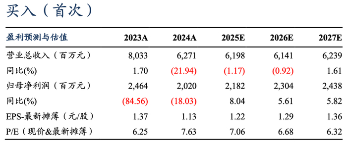 2)其他业务:①节能装备:积极开拓海外增量,稳健发展,预计2025-2027年收入和毛利与2024年持平;②新型建材:受市场需求影响,预计2025-2027年收入增速为-10%、-7%、-5%,随着工艺优化和成本管控加强,预计2025-2027年毛利率恢复至5%。③新能源业务:公司聚焦新能源材料产品应用及市场拓展,预计2025-2027年收入增速维持5%,毛利率维持9%。④港口物流:公司积极拓宽优质客户渠道,寻求拓量提价稳增长,预计2025-2027年收入增速恢复至5%,毛利率维持60%。