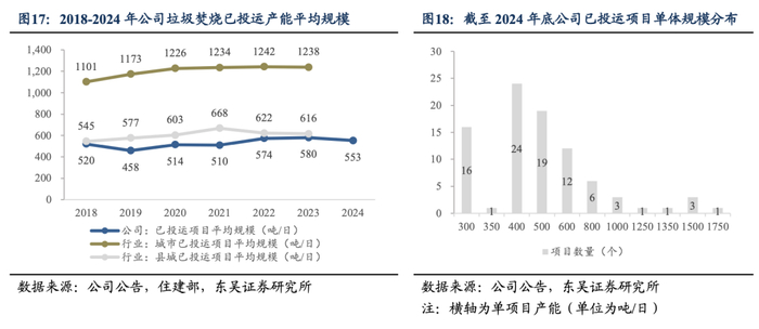 公司项目集中布局中小城市,小型化项目居多,开拓海外市场。公司垃圾焚烧项目聚焦中小城市,实现了垃圾焚烧行业的后来居上。截至2024年底,公司项目主要分布于云南(投运产能6400吨/日,下同)、安徽(6000吨/日)、山东(4600吨/日)、贵州(4200吨/日)、湖南(3950吨/日)等省份的中小城市。为适应当地人口及生活垃圾产量规模,公司项目单体规模集中于300~600吨/日,相应较小。同时,公司积极拓展海外市场,布局了越南北宁项目(已投产,300吨/日)、越南太原项目(储备项目,500吨/日)和越南春山项目(储备项目,1000吨/日)。