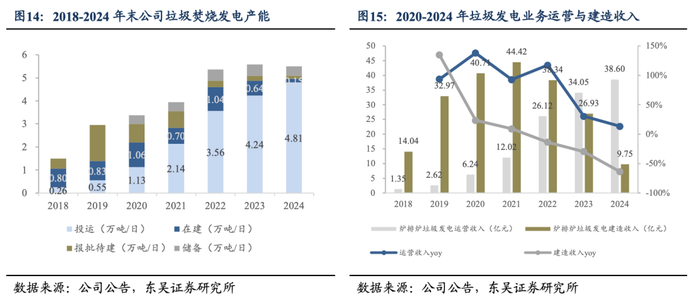 国内市场接近饱和,公司投运高峰已过,建造收入持续下降。2018-2024年间,公司垃圾焚烧发电在手产能从1.50万吨/日增至5.50万吨/日。2019-2021年是扩张高峰,系公司大量中标项目所致。2022年公司实现对雅居乐控股、杭州锦江集团等下属11家垃圾发电项目的收购,新增运营产能0.99万吨/日。2022年后,由于国内行业逐渐饱和,新增招投标项目收缩,公司新签订单数量缩减。随着存量项目建成投运,公司在建、报批待建项目规模收缩,建造收入持续下降。截至2024年底,公司垃圾焚烧已投运产能4.81万吨/日(同增14%),在建产能0.15万吨/日(同减77%),报批待建项目0.13万吨/日,储备项目0.41万吨/日,在建及待建产能/投运产能为6%。2024年公司垃圾焚烧运营收入38.60亿元(同增13%),建造收入9.75亿元(同减64%)