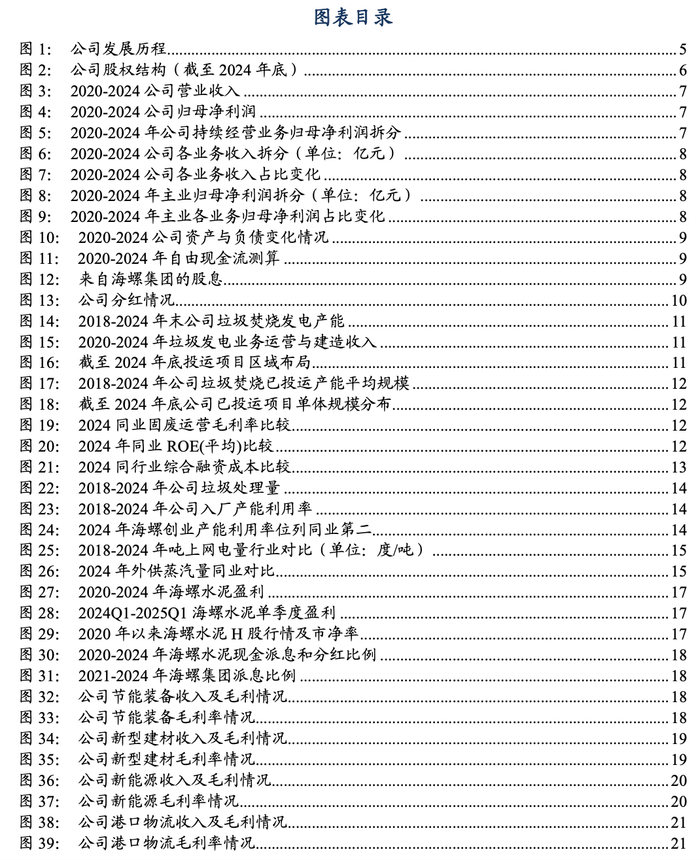 公司主业聚焦垃圾焚烧发电,间接持有海螺水泥17.8%股权。2002年,海螺创业前身安徽海螺创业投资有限责任公司因海螺集团响应混合所有制改革的号召应运而生,成为一家由员工持股的公司。2013年12月19日,公司以红筹股架构在香港联合交易所主板上市。2014-2017,公司锐意进取,成功拓展金寨、平凉、石门、双峰等多个垃圾处理项目。2015年,海螺创业成功增资控股西安尧柏环保公司,并全资投资第一个固废危废项目—芜湖海创,逐步形成炉排炉生活垃圾焚烧发电与固废危废处置两大核心技术的双轮驱动的格局。2021年,公司进军新能源材料产业赛道。2022年,公司成功拆分工业固危废处置业务(海螺环保),于香港联交所正式上市。截至2024年末,公司形成以垃圾焚烧发电为主,节能装备、新型建材、新能源、港口物流协同发展的业务格局。此外,公司通过持有49%海螺集团的股权,间接持有17.8%海螺水泥股权。