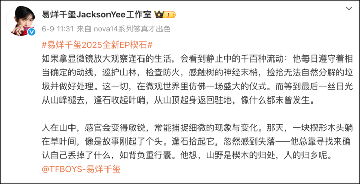 值得一提的是,6月9日,易烊千玺曾官宣全新EP《楔石》,新歌主题也暗示了演唱会即将召开。