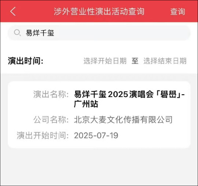 6月11日,记者查询文旅市场通发现,易烊千玺演唱会广州站已获批,定档7月19日开唱,演唱会主题为礐嶨。