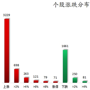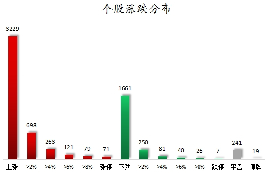 个股涨跌情况,截至收盘,沪深两市合计3229只个股上涨,1661只个股下跌,平盘个股241只,停牌的个股19只。不含当日上市新股,共有71只个股涨停,7只个股跌停。