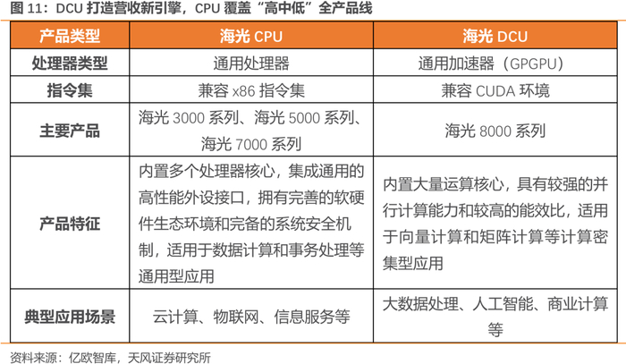 海光信息公司产品包括通用处理器(CPU)和协处理器(DCU)。其中,海光CPU系列产品兼容x86指令集以及国际主流操作系统和应用软件,性能领先优异,软硬件生态丰富,安全可靠,得到了国内用户的高度认可,已经广泛应用于政务、电信、金融、互联网、教育、交通、医疗、企业等重要行业或领域。国内主要OEM厂商(如联想、浪潮、新华三、中兴、中科可控、同方等)已经开发了多款海光服务器、终端等整机产品,有力地推动了海光CPU和DCU的产业化。海光整机拥有业内最全产品线类型,约近百款,可以满足客户云边端全栈各场景需求,搭载海光最新一代CPU的整机产品性能比肩国际主流系列,基于海光C86技术路线优势,其整机产品原生兼容业内99%软件,可做到业务0痛感迁移,有效提升业务效率。