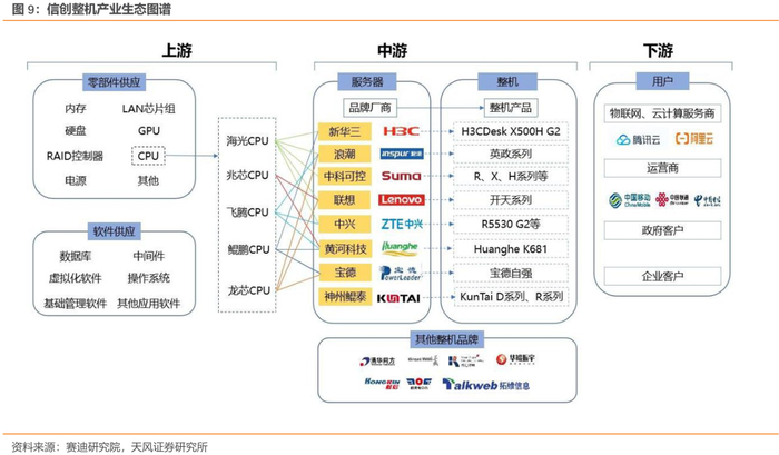 信创整机产业链上游为CPU、GPU、硬盘、内存、总线等核心零部件供应商一级操作系统、数据库、中间件、虚拟化等基础软件供应商。中游为各大服务器品牌厂商、整机厂商及白牌(OEM、ODM)厂商,将零部件进行组装,成为可直接使用的整机。大部分的服务器厂商也是整机产品生产商,并且有自己的信创整机品牌,如联想的开天系列产品、浪潮的英政系列产品等。下游客户则主要包括物联网、云计算服务商,运营商,各类政府客户及企业客户。