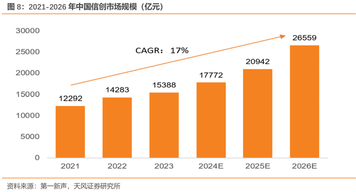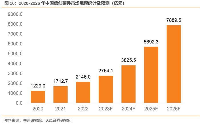 经过前期的试点推进,2020年,信创硬件产品正式进入推广元年,从党政的试点领域逐渐向金融、电信、电力等关系国计民生的重要行业加速渗透,中石化、中交集团、中国稀土、中储粮、中国移动、中国联通等央国企在信创硬件推广应用上起到了重要作用,推动信创硬件产品持续落地,信创硬件产品采购步入常态化阶段。2022年,中国信创硬件市场规模为2146.0亿元。2023年,中国信创产业进入新一轮的发展周期。一方面,在建设领域上进一步扩展,由党政、关基向更多的民用领域拓展,信创硬件市场空间将会加速释放,预计2026年将达到7889.5亿元。