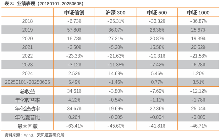 以2019年1月1日至2025年6月5日为样本期,中证信创指数总收益为34.61%,年化收益率为4.22%,波动率为34.67%,夏普比为0.26,业绩表现整体优于沪深300、中证500和中证1000。