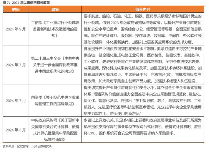 万亿国债有望为信创提供充足需求支撑。《2024年政府工作报告》中提出,为系统解决强国建设、民族复兴进程中一些重大项目建设的资金问题,从2024年开始拟连续几年发行超长期特别国债,专项用于国家重大战略实施和重点领域安全能力建设。在支持领域方面,筹集资金将重点支持科技创新、城乡融合发展、区域协调发展、粮食能源安全、人口高质量发展等领域建设。