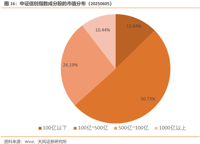 截至2025年6月5日,中证信创指数中有17只成份股总市值在100亿元以下,合计权重12.64%;总市值位于100亿元至500亿元的成份股共24只,合计权重50.73%;总市值位于500亿元至1000亿元的成份股共有6只,合计权重26.19%;总市值超过1000亿元的成分股有2只,占权重10.44%。