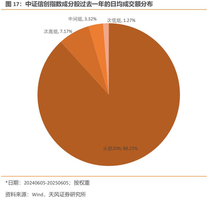 将全市场的股票按照过去一年的日均成交额分为5组,根据成分股权重计算,截至2025年6月5日,中证信创指数中处于头部20%区间的成分股权重占比为88.25%,处于次高组的权重占比为7.17%,处于中间组的权重占比为3.32%,合计权重98.73%,流动性良好。