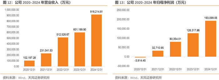 海光信息在信创推动下迎来高速增长,2020~2024年,公司营收由10.22亿元增长至91.62亿元,CAGR高达73.04%;归母净利润由-0.39亿元增长至19.31亿元,净利率增长至29.65%。2025Q1,公司营收24.00亿元,同比增长50.76%,归母净利润为5.06亿元,同比增长75.33%。