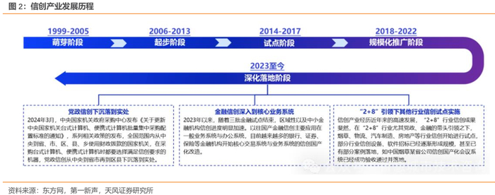 中国信创产业的发展脉络实际上早于“信创”概念的提出。从历史沿革来看,我国信创产业从1999年时任科技部部长徐冠华提出“中国信息产业缺芯少魂”开始萌芽,2006年“核高基”重大专项政策的推出开始起步。到2014年中央网络安全与信息化领导小组成立,信创进入试点实践,2018年华为、中兴被美国制裁,美国加大对中国进出口限制,信创产业招投标数量迅速提升,进入规模化推广阶段,2023年党政信创从中央到省市再到区县下沉落到实处,金融信创深入到核心业务系统,“2+8”引领下其他行业开始信创试点实施,信创产业进一步深入推进,逐步进入深化落地阶段。