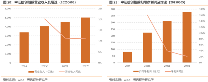 中证信创指数2024年营业收入为3378.41亿元,归母净利润为80.16亿元,截至2025年6月5日,根据Wind一致预测,中证信创指数2025年、2026年、2027年的预期营业收入分别为4055.89亿元,4520.20亿元和5021.12亿元,同比增速分别为20.32%、11.45%和11.08%;预期归母净利润分别为223.71亿元,312.44亿元和378.04亿元,同比增速分别为160.38%、39.66%和21.00%。该指数预期盈利能力良好,盈利预期增速较高,具备未来发展潜力。