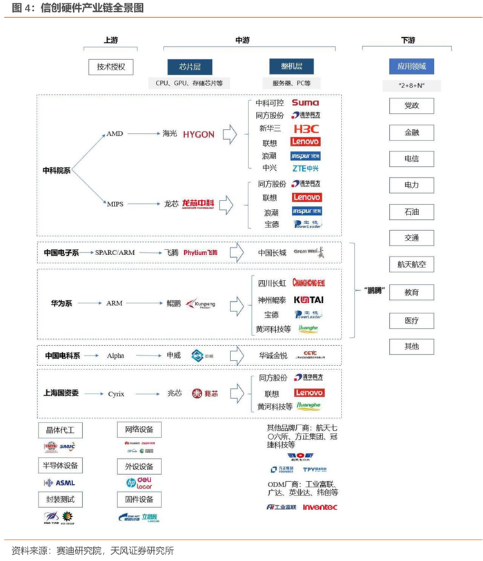 (1)中科院系:拥有龙芯CPU和海光CPU两大CPU技术路线。其中,龙芯CPU形成以同方、联想、浪潮、宝德等为整机厂的LoongArch(在MIPS基础上自研)信创硬件产品体系,海光CPU形成以新华三联想、浪潮、同方、中科可控等为主要整机厂的C86(完全兼容x86)信创硬件产品体系。