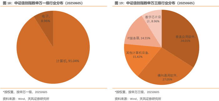截至2025年6月5日,按申万一级行业,中证信创指数行业集中度高,完全分布在计算机和电子行业,权重占比为91.04%和8.96%;按申万三级行业,该指数主要权重板块集中在垂直应用软件(34.01%)、横向通用软件(27.05%)和其他计算机设备(15.42%)等行业,围绕信创板块,板块定位准确。