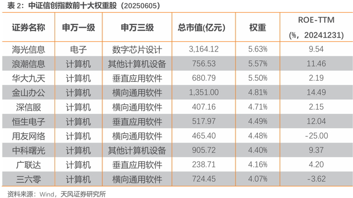 中证信创指数前十大权重股合计权重为47.82%,权重集中度适中,平均总市值为921.18亿元。根据申万一级,该指数前十大权重股主要覆盖电子和计算机行业;根据申万三级,该指数前十大权重股覆盖数字芯片设计、其他计算机设备、垂直应用软件和横向通用软件行业。截至2024年12月31日,前十大权重股的ROE(TTM)中位数为6.78%,盈利水平良好。