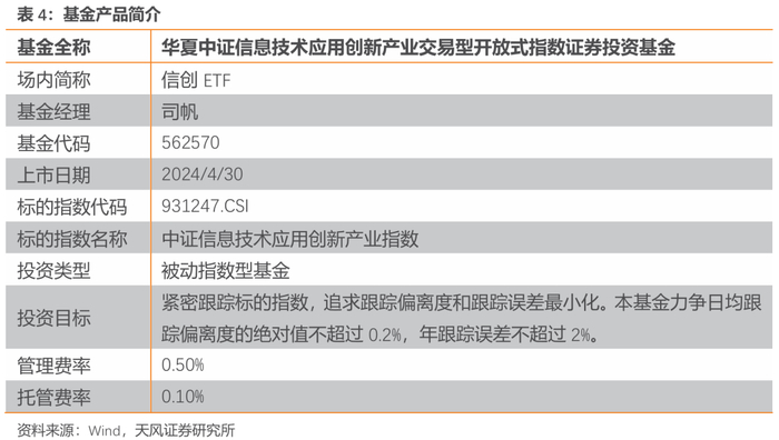 华夏中证信息技术应用创新产业交易型开放式指数证券投资基金(场内简称“信创ETF”,基金代码“562570”)于2024年4月30日上市,跟踪中证信息技术应用创新产业指数。截止至2025年6月5日,信创ETF基金规模为26.40亿元,近一年日均成交额为0.24亿元,是目前市场上跟踪该指数规模最大、流动性最好的ETF产品。信创ETF有2只联接基金:华夏中证信息技术应用创新产业联接A(基金代码“022384.OF”)和华夏中证信息技术应用创新产业联接C(基金代码“022385.OF”)。