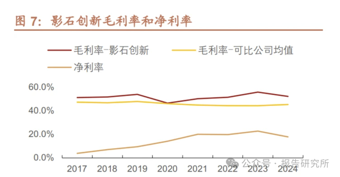 分产品看,核心业务消费级设备收入保持快速增长,是主要毛利来源。 2017-2024 年消费级智能影像设备保持快速增长趋势,是公司收入绝大多数收入 来源,2024 年收入达 47.89 亿元,17-24 年 CAGR 为 75.53%,主要系伴随智 能影像设备行业规模扩大,加之公司不断创新型产品,消费级智能影像设备销量 持续增大,且消费级设备 2022-2024 年毛利率保持在 50%以上水平,是公司主 要毛利来源。同时伴随智能影像设备销量扩大,公司不断丰富智能影像设备相关 配件产品,带动配件及其他产品收入持续增长。