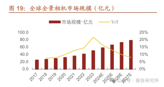 随着应用领域不断拓宽,全球全景相机的市场规模有望从 2023 年的 50.3 亿元 增长至 2027 年的 78.5 亿元。全景技术最早出现在二十世纪九十年代,少数高 端数码相机通过连续拍摄普通窄视角图像加后期软件拼接生成全景图片,但未有 专门拍摄全景影像的设备。2015 年日本理光发布的第一款 360°全景相机,全 景相机市场正式开启。因为其捕捉视角全面、创意多变且内容适配于手机等各类 终端设备等特点,全景相机受到越来越多消费者的关注。据 Frost&Sullivan,2023 年全球全景相机市场规模、出货量分别增长至 50.3 亿元、196 万台,2017-2023 年 CAGR 为 12.3%、14.2%,随着全景相机在户外运动、远程医疗、智慧城市 等专业领域中不断渗透,未来全景相机市场规模也将进一步扩大,预计 2027 年 市场规模、出货量分别增长至78.5 亿元、316 万台,2023-2027 年CAGR 为11.8%、 12.7%。