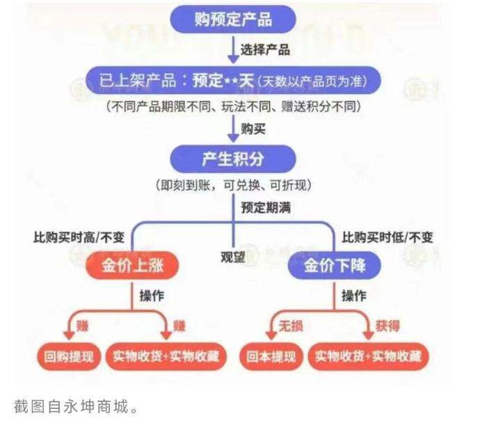 永坤黄金有线上线下两种投资渠道。在线上,永坤商城平台推出了“预定专区”“黄金回购”“现货黄金”等产品。据其发布的“预定金条如何实现保本保利”新手教程介绍,投资人购买预定产品(选择的产品不同,期限和玩法不同)后,会产生积分收益,积分即刻到账,可兑换、可折现。待预定期满,若金价上涨,投资人取货后选择线上回购,可以获得黄金涨价的收益;若金价下跌,投资人选择金条退款,购买金额原价退回(赚取购买时赠送的积分)。