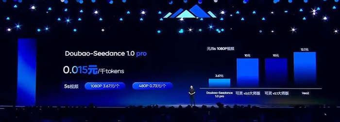 此外,Seedance 1.0 Pro 的价格也具有一定性价比。Seedance 1.0 pro 模型价格为 0.015 元 / 千 tokens,生成一条 5 秒的 1080P 视频只需 3.67 元。