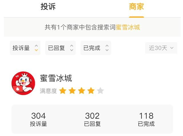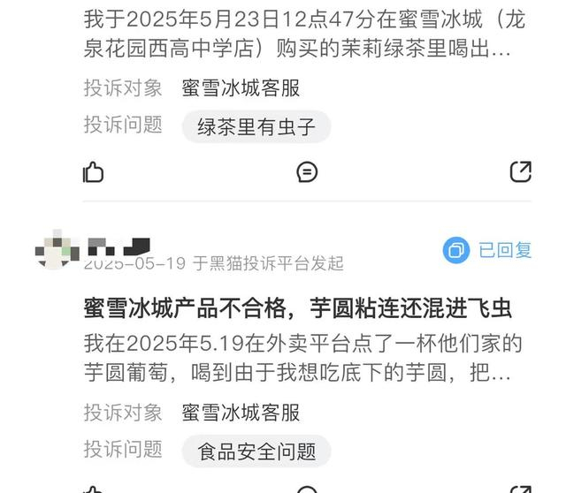 黑猫投诉平台上有关蜜雪冰城的投诉