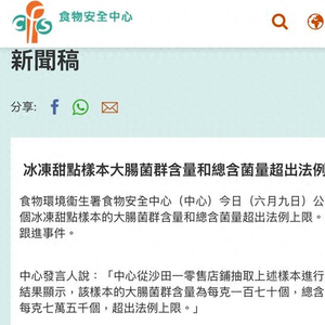 样本检测结果显示,该样本的大肠菌群含量为每克170个,总含菌量为每克75000个,超出香港法律上限。目前该中心已通知有关商户上述违规事项,该商户已按中心指示停售及弃置相关食品。根据香港《冰冻甜点规例》(第132AC章),任何供出售的冰冻甜点,每克不可含有多于100个大肠菌群或多于50000个细菌。违法者一经定罪,最高可处罚款一万港元及监禁三个月。