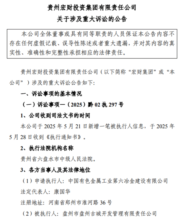 从公告得知,今年5月28日,贵州宏财收到法院执行通知书,其于5月21日新增一则被执行人信息,执行标的金额约3.17亿元。