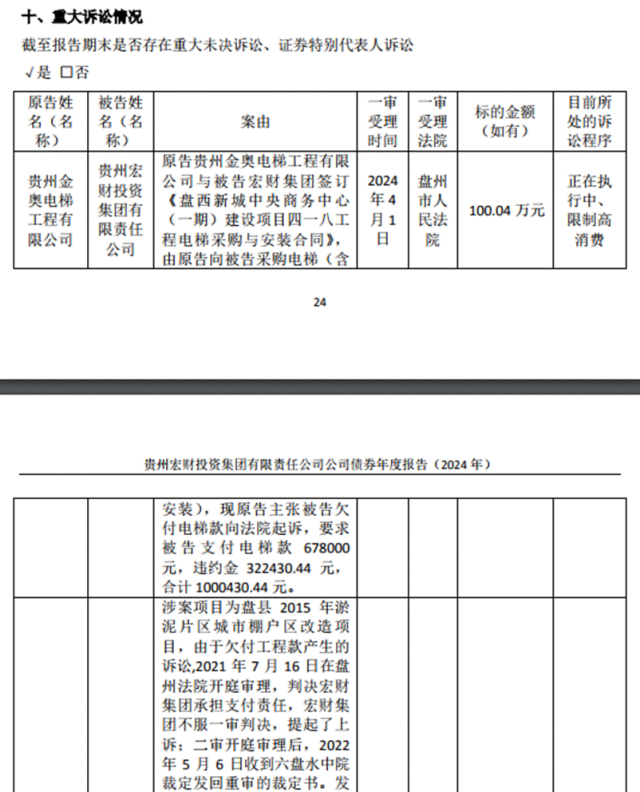 公司面临的诉讼风险及“失信”情况,贵州宏财在2024年度公司债券报告中也有披露:“截至2024年末,公司存在多笔未决诉讼及被执行案件,并被列入失信被执行名单。”