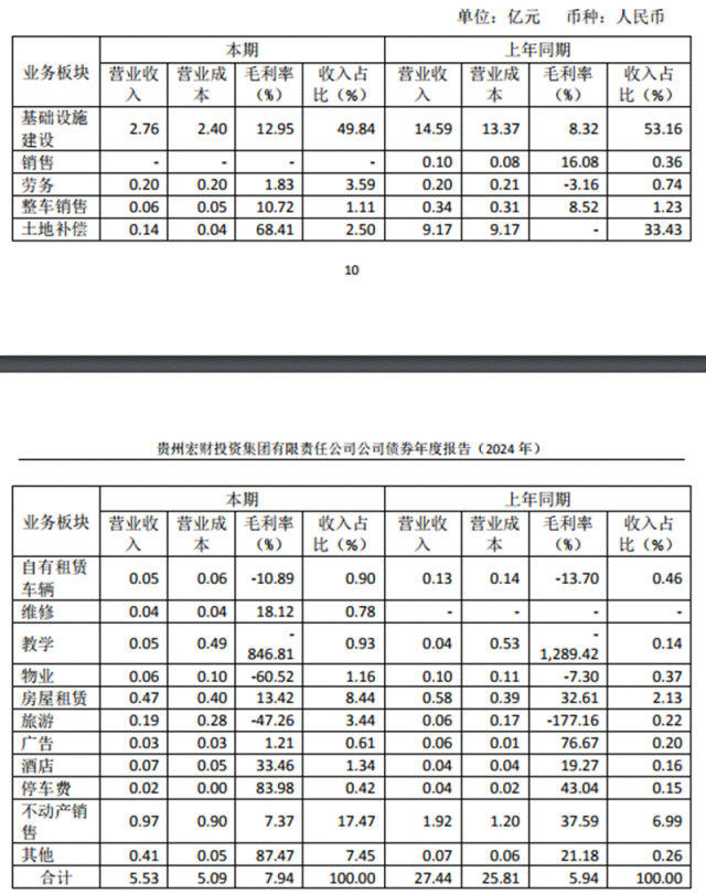 2023年、2024年,贵州宏财营业收入分别为27.44亿元、5.53亿元,同比下滑28.94%、79.84%,其中基础设施建设业务分别贡献收入14.59亿元、2.76亿元,占比分别为53.16%、49.84%。