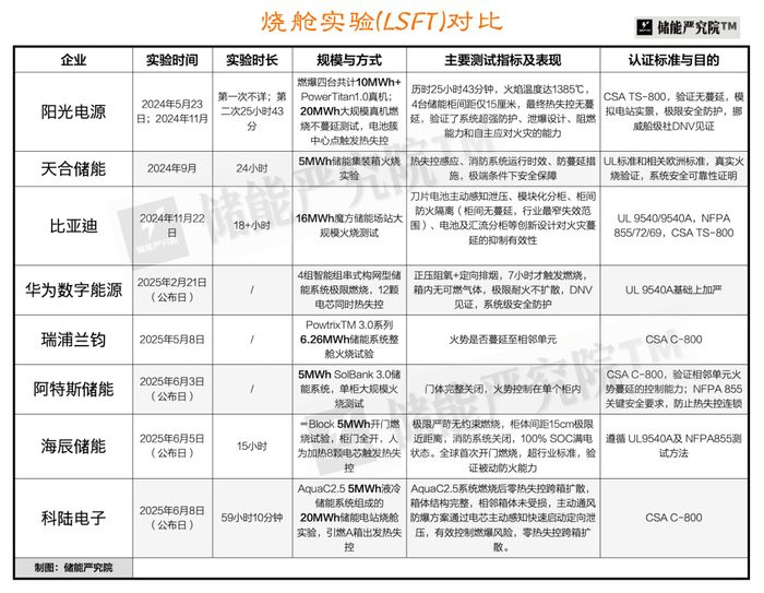 据公开资料,阳光电源、华为、比亚迪、天合、阿特斯、瑞浦兰钧、海辰储能与科陆电子等企业已陆续开展实景烧舱试验。