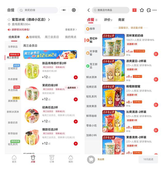 左:蜜雪冰城点单小程序;右:京东外卖蜜雪冰城