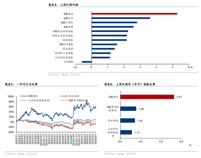 市场方面,上周通信(申万)指数上涨5.27%,同期上证综指上涨1.13%,深证成指上涨1.42%。上周,博通发布TH6芯片,加速推进CPO技术落地;2QFY25博通业绩强劲,业绩会中披露2QFY25 AI业务收入中,网络产品(以太网交换芯片、网卡等)贡献40%,同时公司预计至少三家客户将在2027年部署百万卡集群。我们看好光模块板块投资机会,建议关注:业绩持续高增长&PE估值尚处低位的标的;看好CPO、DCI等发展前景。