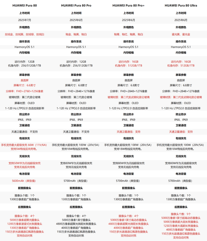 再附上官网给出的Pura 80系列四款型号主要参数对比表。