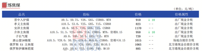 5、11日太原市场炼焦煤价格暂稳。本周炼焦煤价格跌势放缓,但整体成交依旧清淡。随着下游焦钢企业库存已降至绝对低位,上游在高库存压力之下,产量也开始收缩,本周煤价降幅开始收窄,预计短期炼焦煤价格依旧维持弱势下行态势。现古交低硫主焦煤(A9.5S0.5)出厂现金含税价1076元/吨;清徐瘦煤(A10.5S0.6)报价900元/吨。