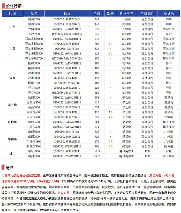 4、山西晋北区域煤价延续稳中偏弱走势,忻州某煤矿混煤(CV4200,S1)含税242元/吨,降15元。煤矿表示,近期煤矿竞拍降多涨少,涨跌幅10-20元不等,电厂采购一般,站台贸易商刚需拉运,个别煤矿有流标情况,短期价格变化不大,关注后期市场供需变化情况。