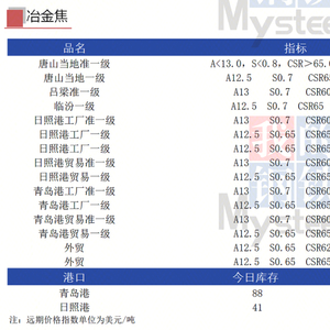 3、11日吕梁市场冶金焦价格偏弱运行。焦炭3轮全部落地执行,但市场拉运依旧缓慢,后市仍有看降预期。基本面来看,目前区域内焦企仍有微利,开工仍在高位,但由于市场下行趋势明显,多数焦企出货梗滞,厂区库存明显堆积,压力逐步显现;需求方面,钢厂悲观情绪较浓,高炉检修持续增多,铁水产量回落预期较强,钢厂控制到货情况较多,短期内焦炭供需结构宽松的情况下,焦炭价格仍以下跌为主,后期需关注钢材价格走势以及铁水产量变动。价格方面:现准一级湿熄冶金焦报1030元/吨,准一级干熄冶金焦报1245-1255元/吨,一级干熄冶金焦报1345-1365元/吨,均出厂价现金含税。