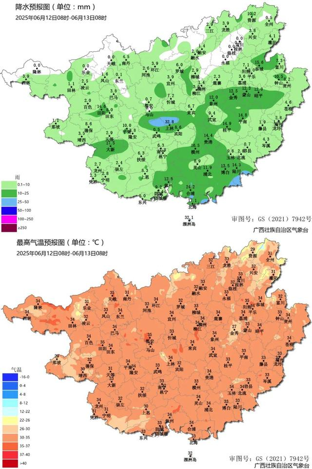 12日晚上到13日白天,桂东南和沿海地区有大雨到暴雨、局地大暴雨,其它地区多云间阴天有阵雨或雷雨。