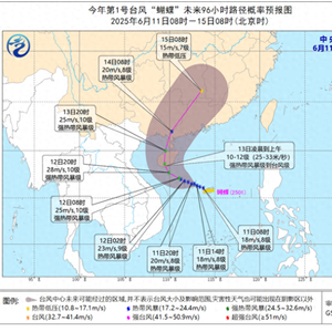 中央气象台6月11日10时发布台风蓝色预警:南海热带低压已于今天(11日)8时在南海中西部海面上加强为今年第1号台风“蝴蝶”(热带风暴级)。